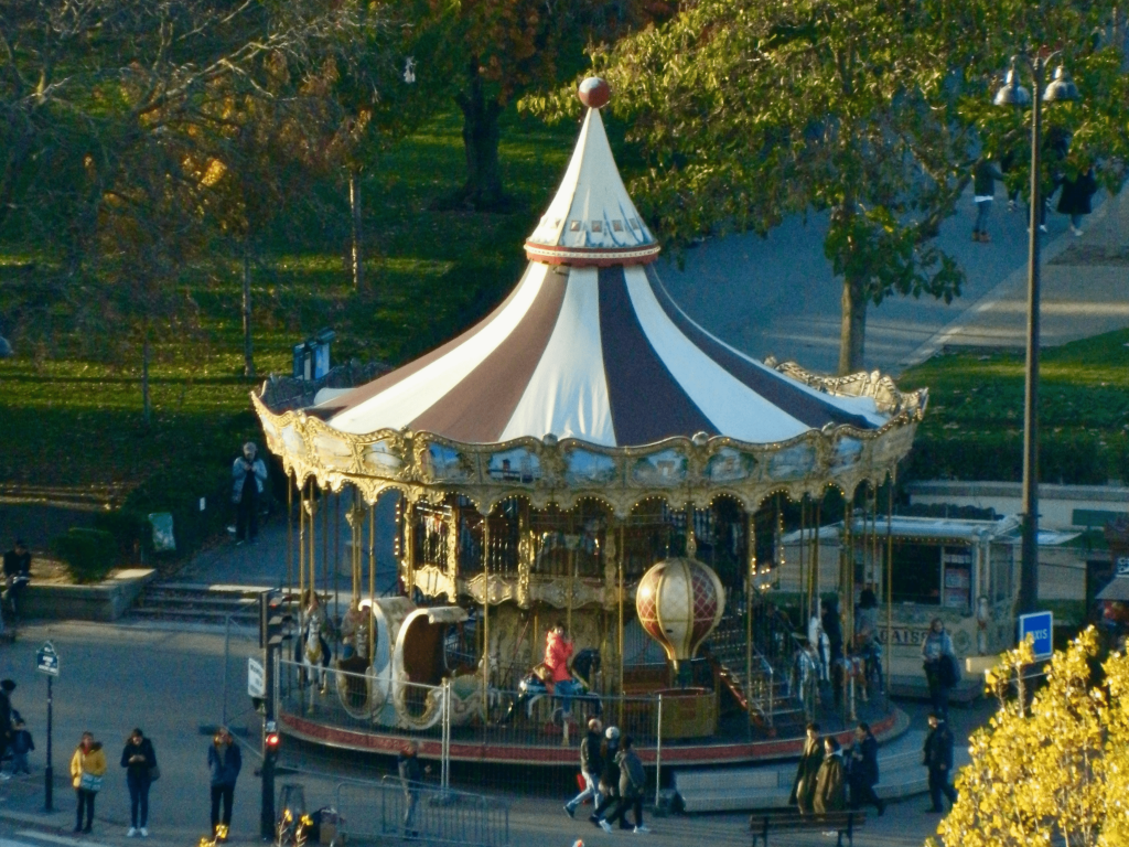 Framed by the ride’s elegant canopy and outlined in hundreds of twinkling bulbs, the view from above feels both grand and intimate—a perfect vantage point for photos, shared laughter, and lasting memories.